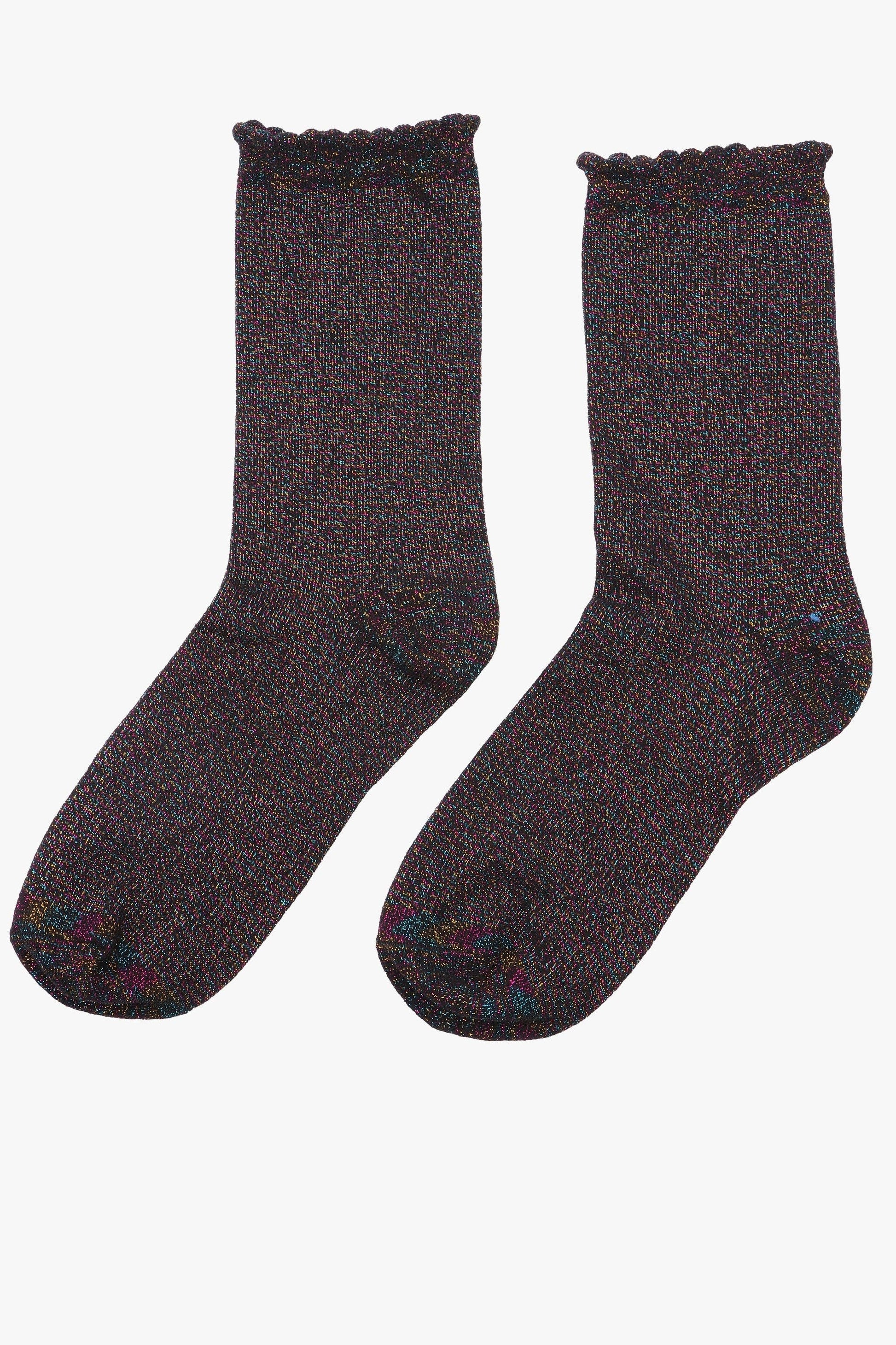 Step into understated elegance with these black ankle socks, where sophisticated simplicity meets playful shimmer. Crafted from a premium cotton-blend fabric, they feature a subtle rainbow glitter finish that catches the light with every step. The scalloped cuff adds a refined detail, while the durable construction—reinforced with metal fibres for lasting wear—ensures these socks maintain their sparkle through regular washing. Perfect for elevating everyday outfits or adding a hint of glamour to special occasions. Fits UK 3-7. Machine washable on delicate cycle.