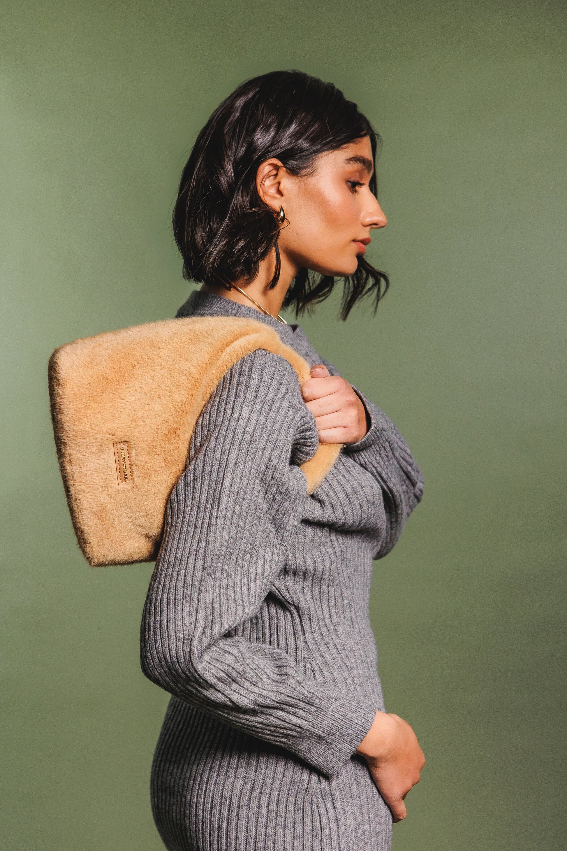 This faux fur handbag in a sophisticated light tan shade is an ideal accessory for autumn/winter 2025 fashion. Featuring elegant gold hardware, it combines style and functionality seamlessly.