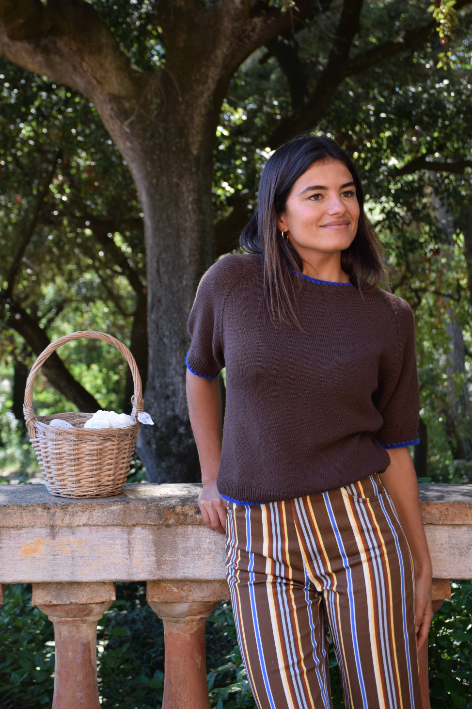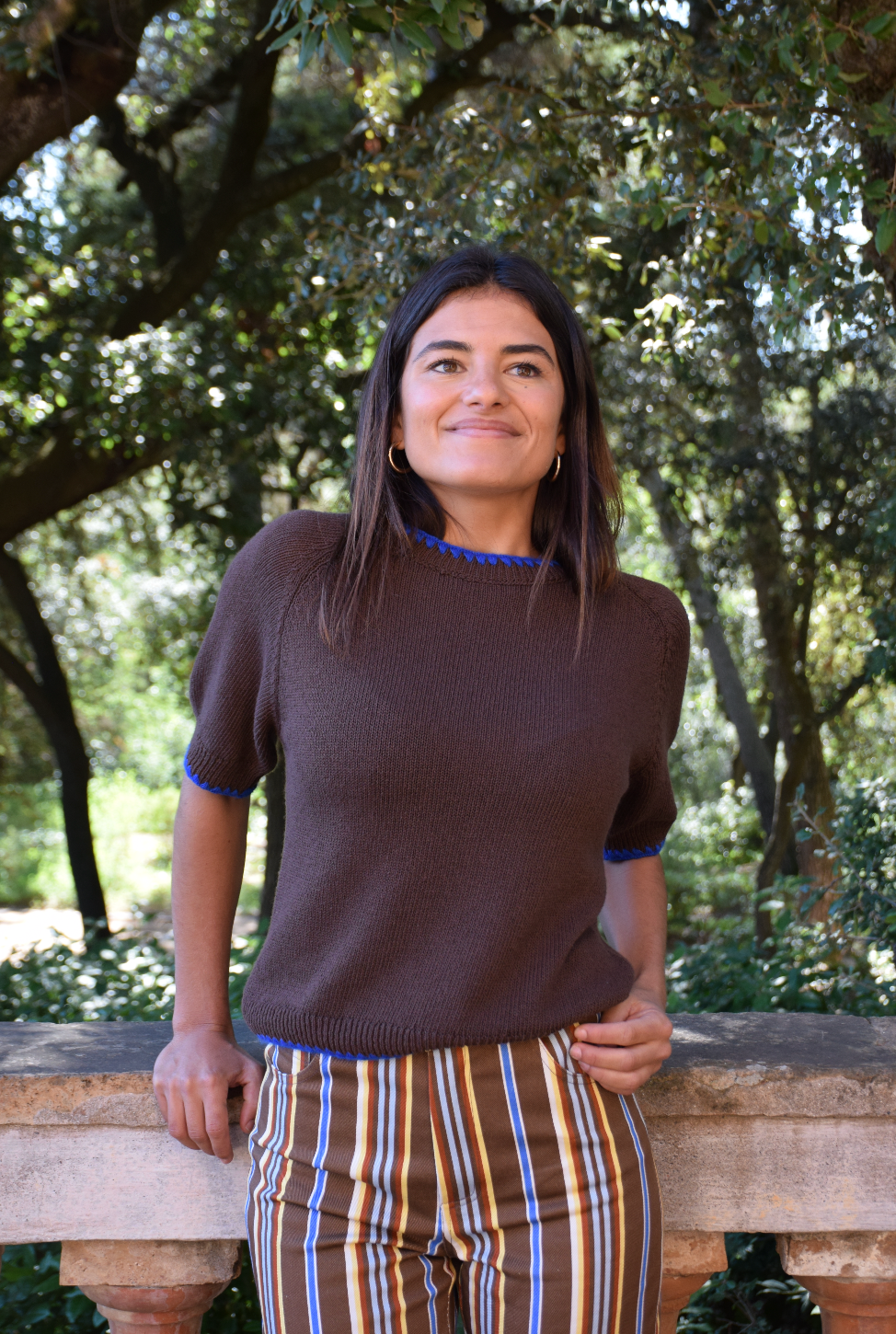 This short-sleeve brown T-shirt features blue embroidered detailing along the neckline, sleeves, and hem. Crafted from a blend of 50% cotton and 50% acrylic, it offers both comfort and durability. The model, standing 164 cm tall, is shown wearing a size S. Designed in Barcelona and manufactured in Europe, this piece blends style with quality craftsmanship.