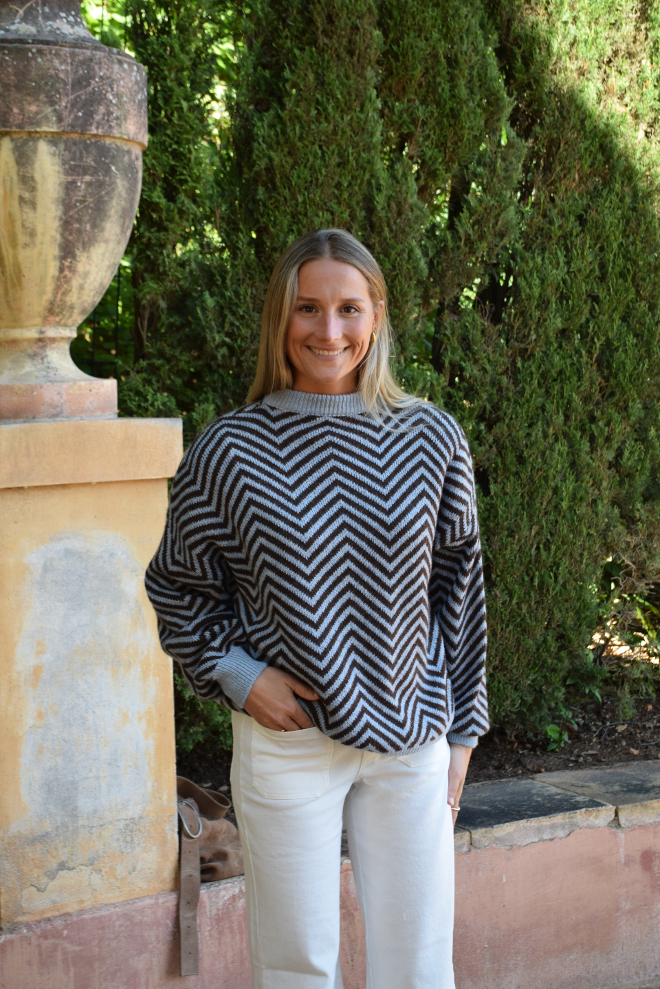 This knit sweater features a distinctive zigzag pattern blending brown and sky blue hues. Crafted from a mix of 60% polyacrylic, 14% polyamide, 10% polyester, 8% wool, and 8% viscose, it offers both comfort and durability. The model, standing 164cm tall, is shown wearing a size S. Expertly designed in Barcelona and produced in Europe.