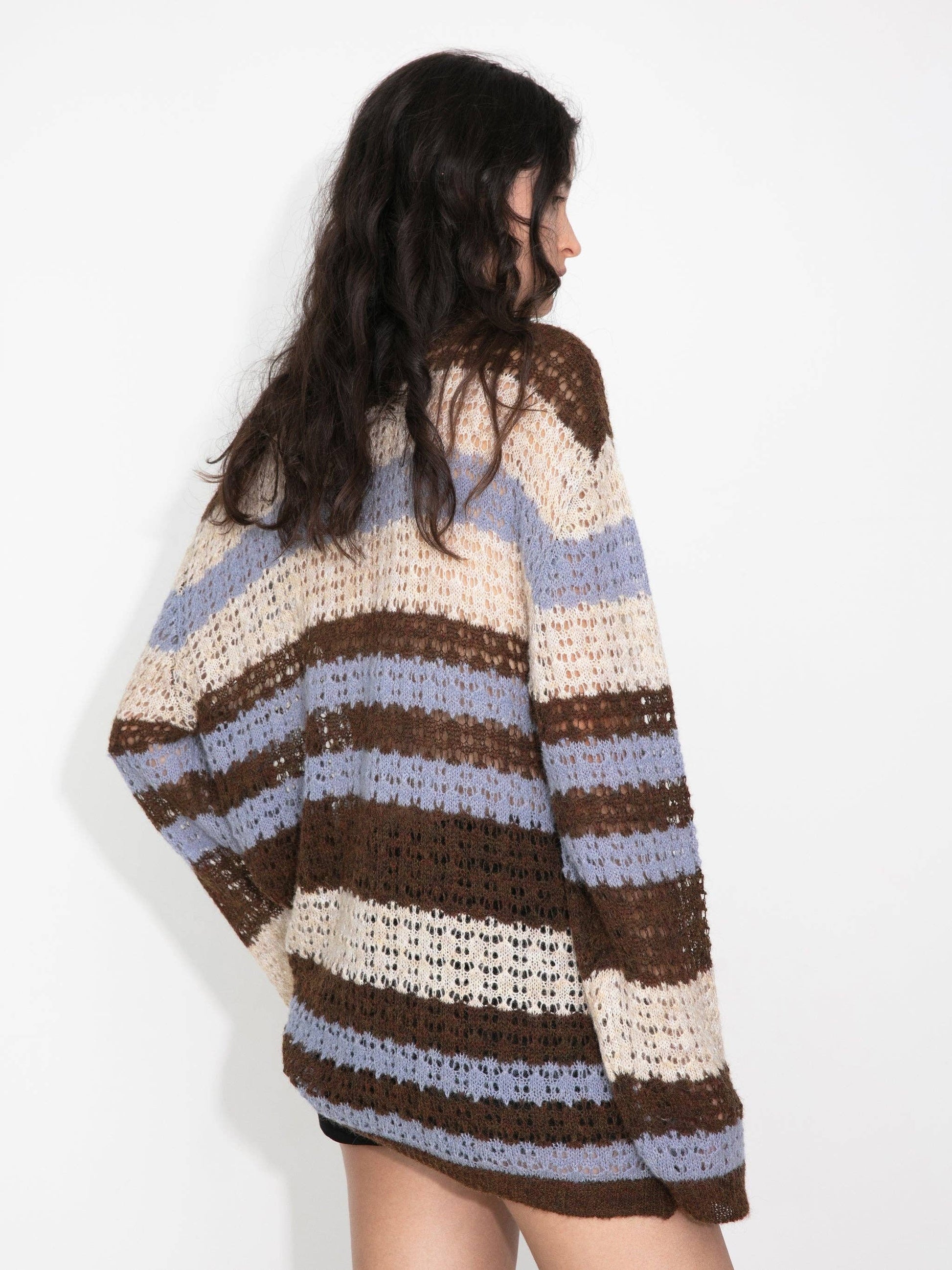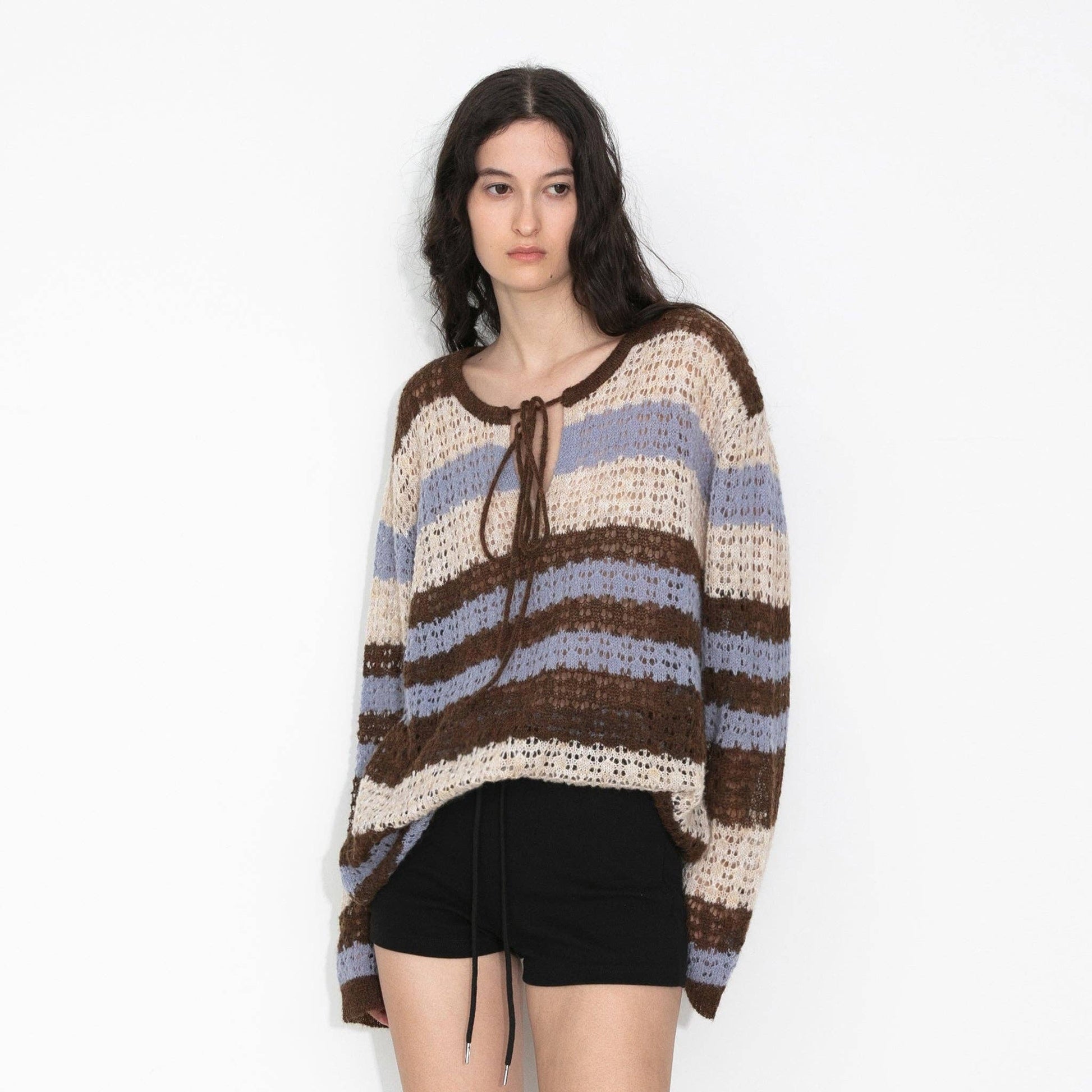 This brown striped colour-block open-knit sweater offers a lightweight, breathable fabric with an open-knit pattern. It includes a drawstring detail at the chest, combining relaxed comfort with a contemporary, stylish flair.