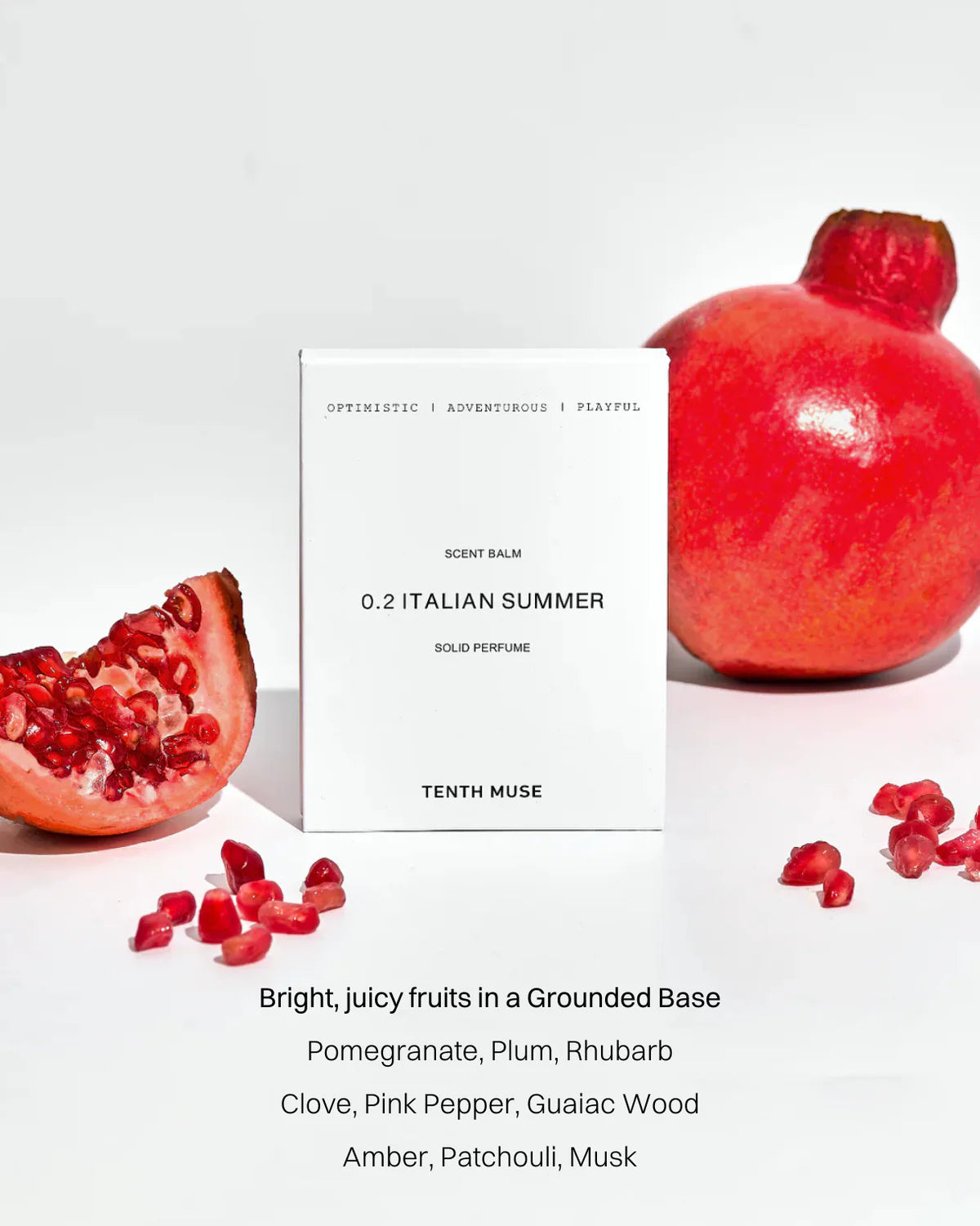 This set includes: x1 Italian Summer Solid Perfume Balm x1 Clean Girl Solid Perfume Balm x1 Butter Refillable Vessel Italian Summer Notes: Top notes: Pomegranate, Plum, Rhubarb Middle notes: Clove, Pink Pepper, Guaiac Wood Base notes: Amber, Patchouli, Musk Clean Girl Notes: Top Notes: Blackcurrant, Grapefruit & Orange Middle Notes: Lily of the Valley, Jasmine & Rose Base Notes: Vanilla, Cedar & Musk