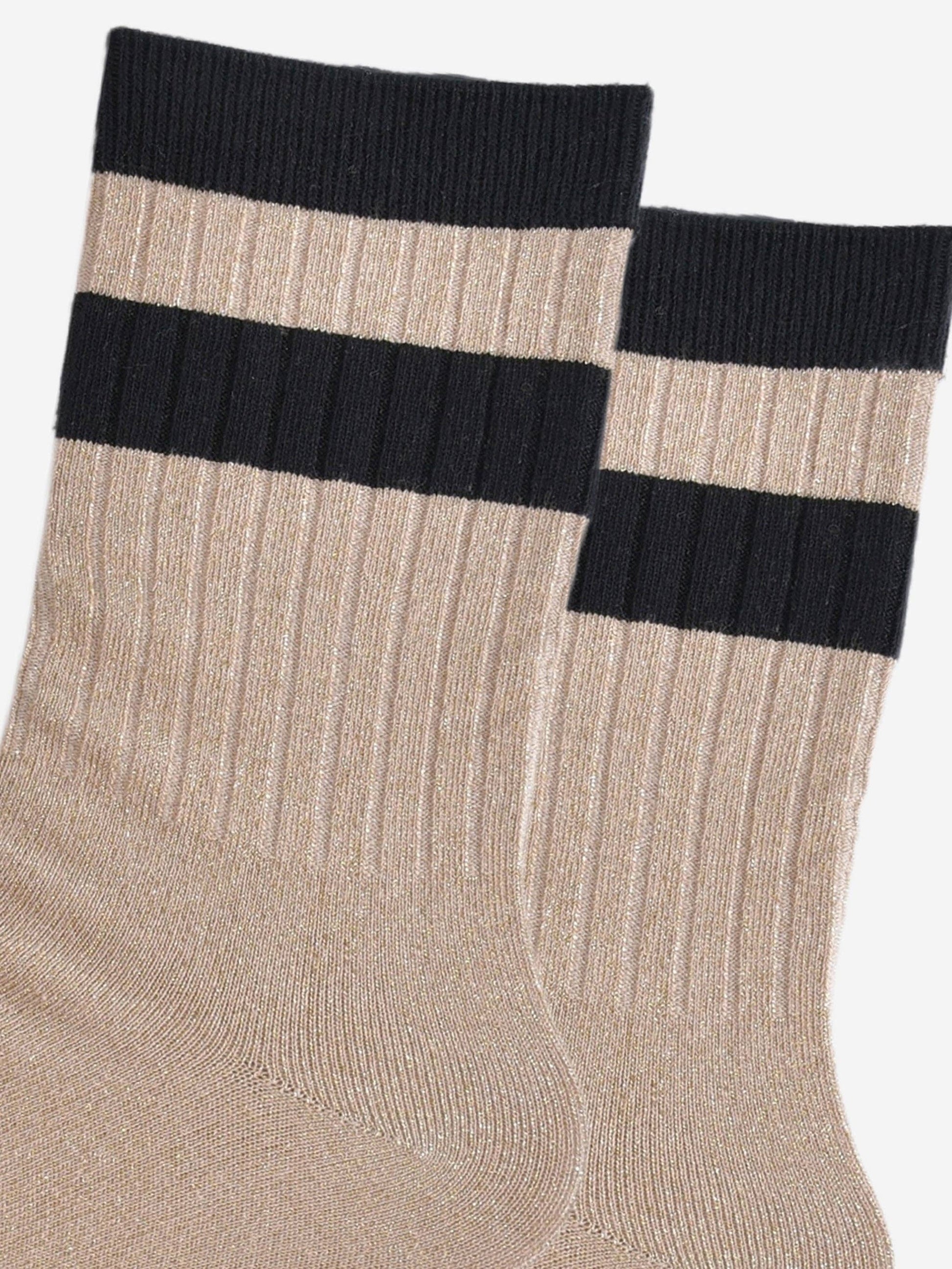Glittering sports style ankle socks crafted from soft blended cotton. Showcasing a classic ribbed design in gold and black with a double striped cuff and eye-catching sparkle.