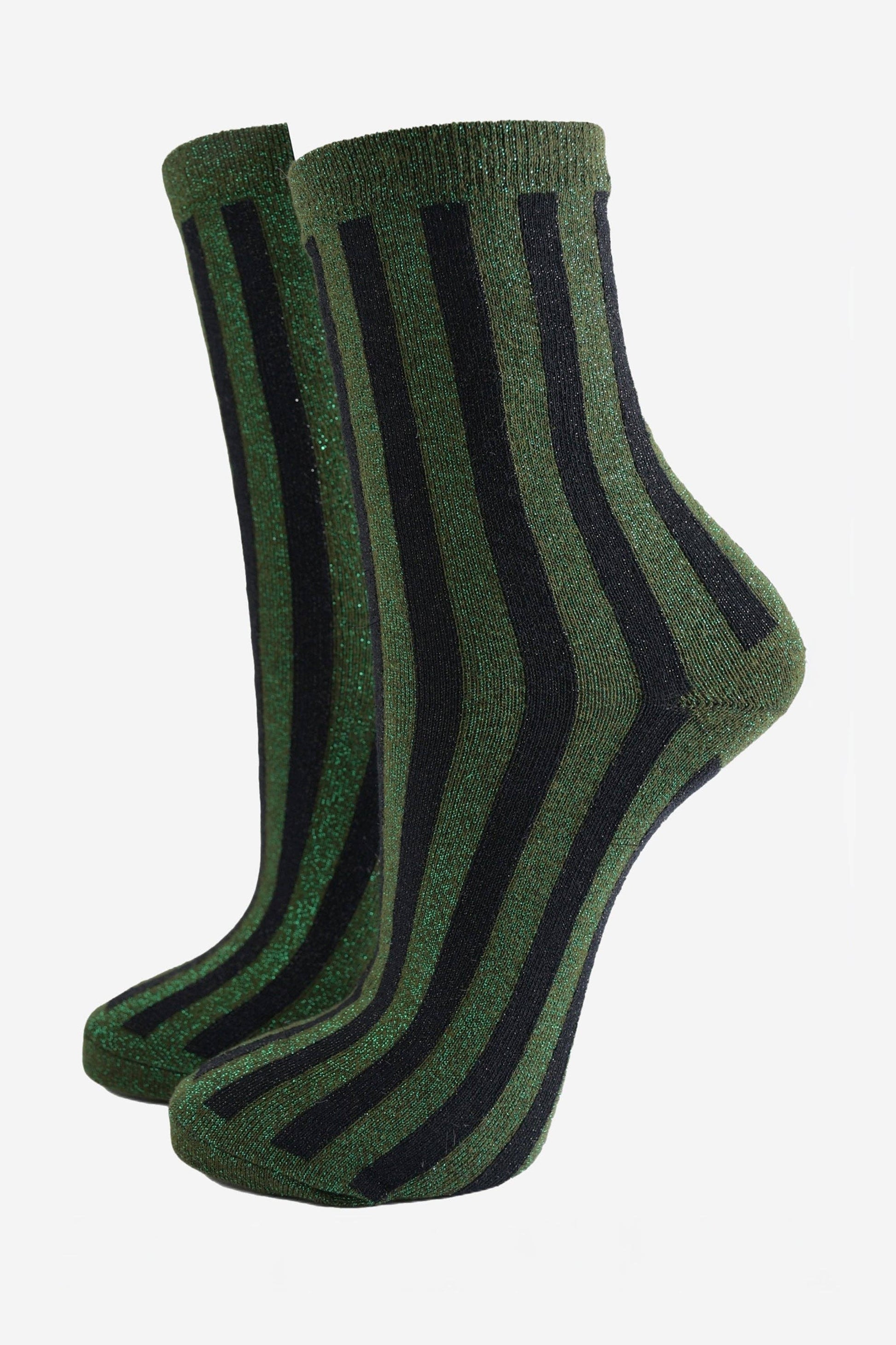 Expertly tailored in the UK, these women's ankle socks blend comfort with contemporary style. The soft cotton composition, enriched with metallic fibres, delivers breathability alongside a sophisticated sparkle. Vertical stripes in contrasting khaki and black create visual interest, while the natural fabric ensures all-day wearability. Sized for UK 3-7 (EU 36-40, US 5-9). Composition: 60% cotton, 25% polyester, 10% metal wire, 5% spandex. Note: loose glitter threads may occur during manufacturing.
